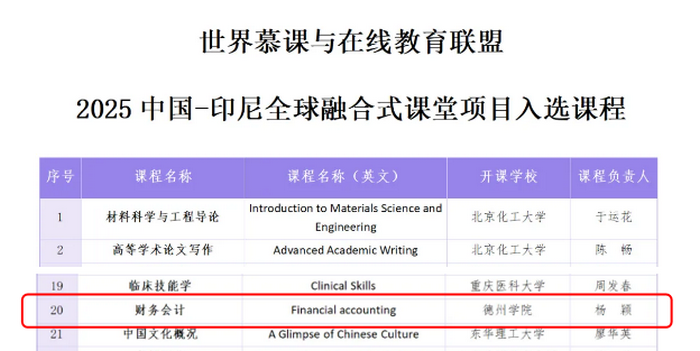 近日,由世界慕课与在线教育联盟发起的2025中国-印尼全球融合式课堂项目课程名单正式公布,我校杨颖教授主讲的《Financial Accounting》课程成功入选。此次入选的课程来自69所高校,覆盖多个学科领域,充分展现了中国高等教育的丰富内涵与卓越水平。