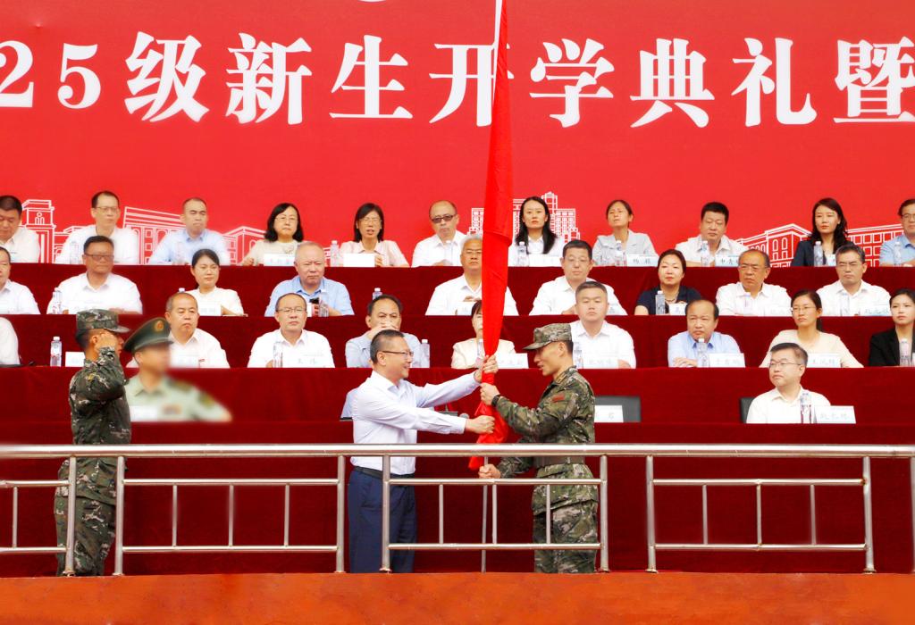 会上,吴君为学生军训团授旗。猎猎团旗感召着全体新生以军训锤炼意志,传承红色基因,做新时代有为青年。