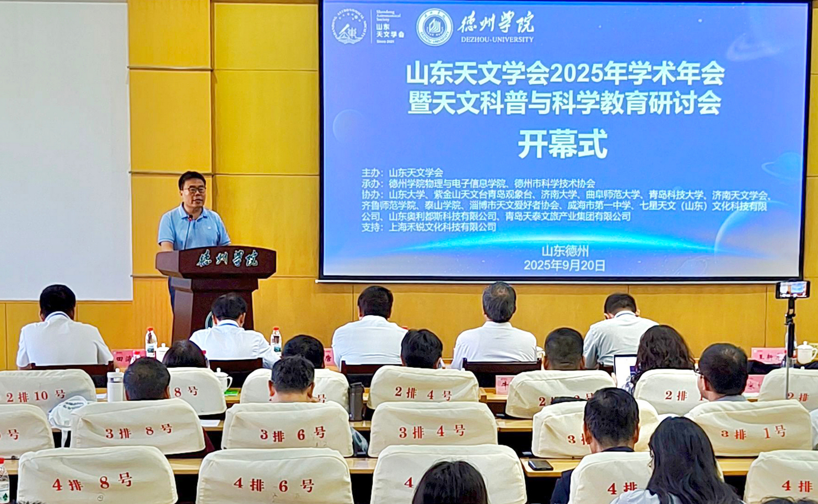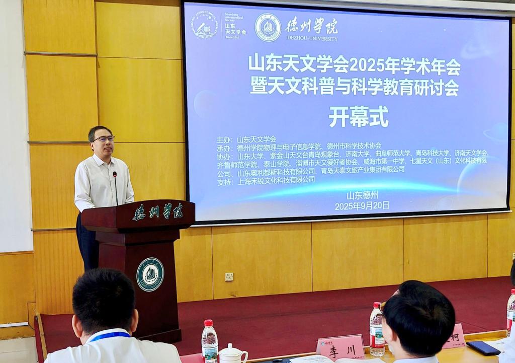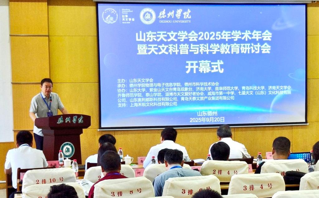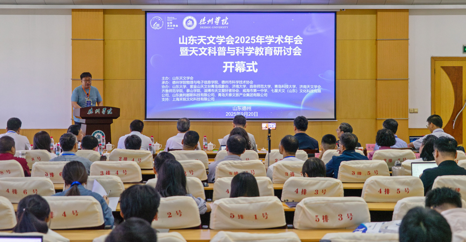 9月20日至21日,由山东天文学会主办,德州学院物理与电子信息学院、德州市科学技术协会承办的“山东天文学会2025年学术年会暨天文科普与科学教育研讨会”在德州学院召开。山东大学空间科学与技术学院院长、山东天文学会理事长陈耀,德州学院党委委员、副校长刘印房,德州市科学技术协会主席王新志出席大会并致辞。