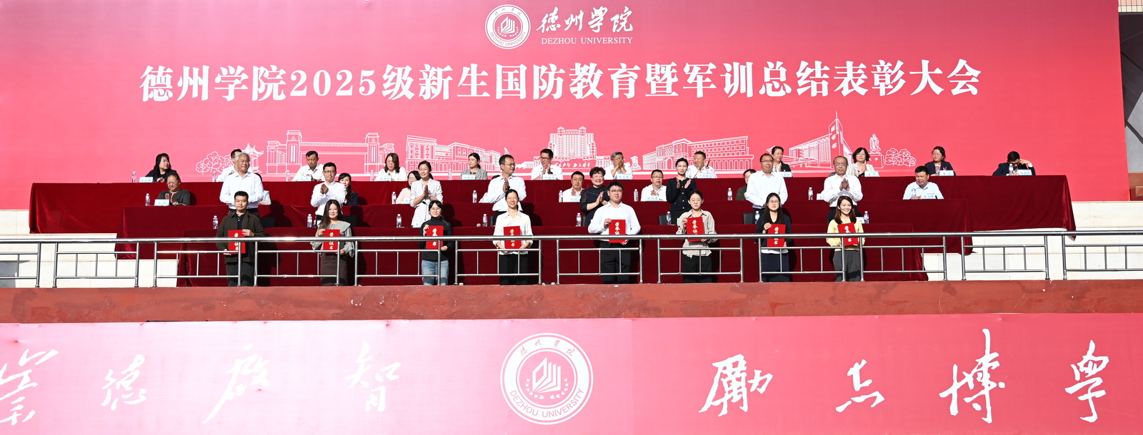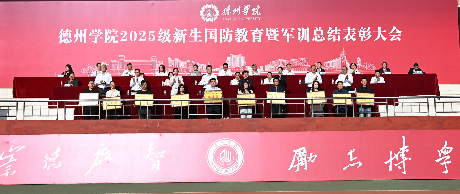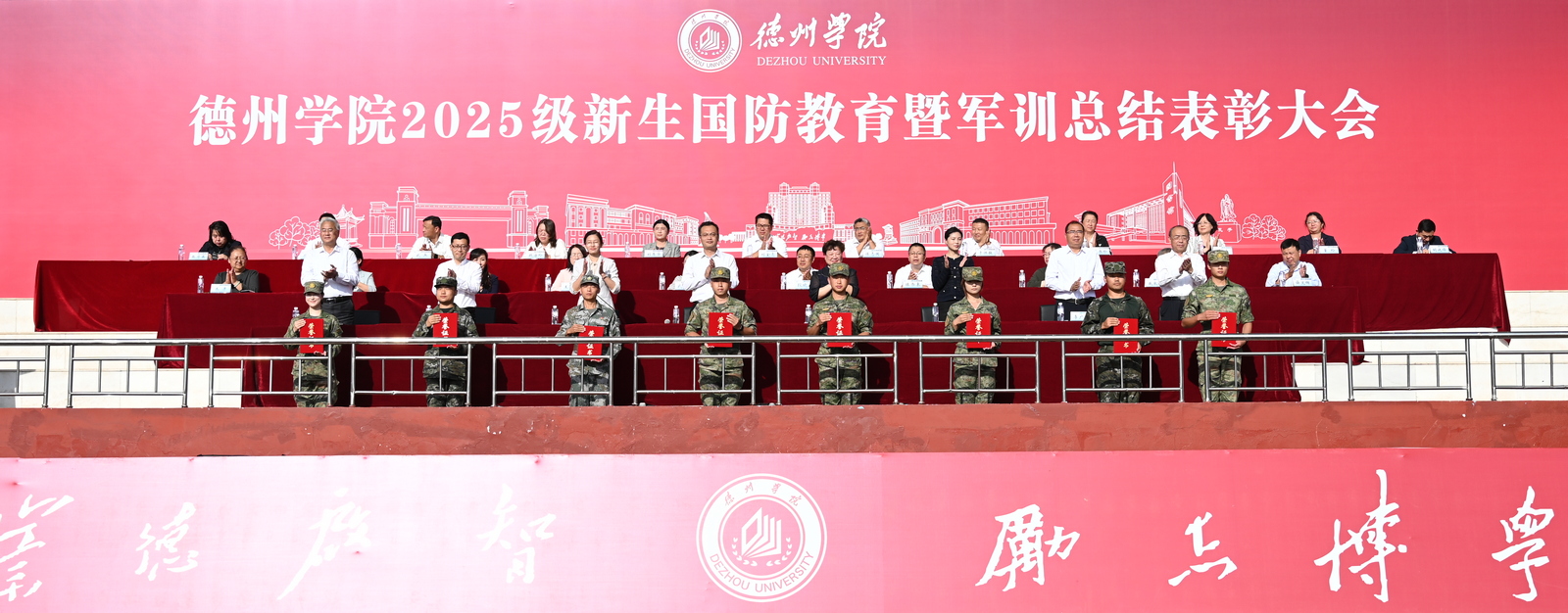 冯琨宣读《德州学院关于表彰2025年新生国防教育先进集体和个人的决定》。大会对10个军训工作先进营、10个内务整理先进单位、25名优秀指导员、75名优秀教官、45名内务整理先进个人、200名军事技能考核先进个人进行了表彰。