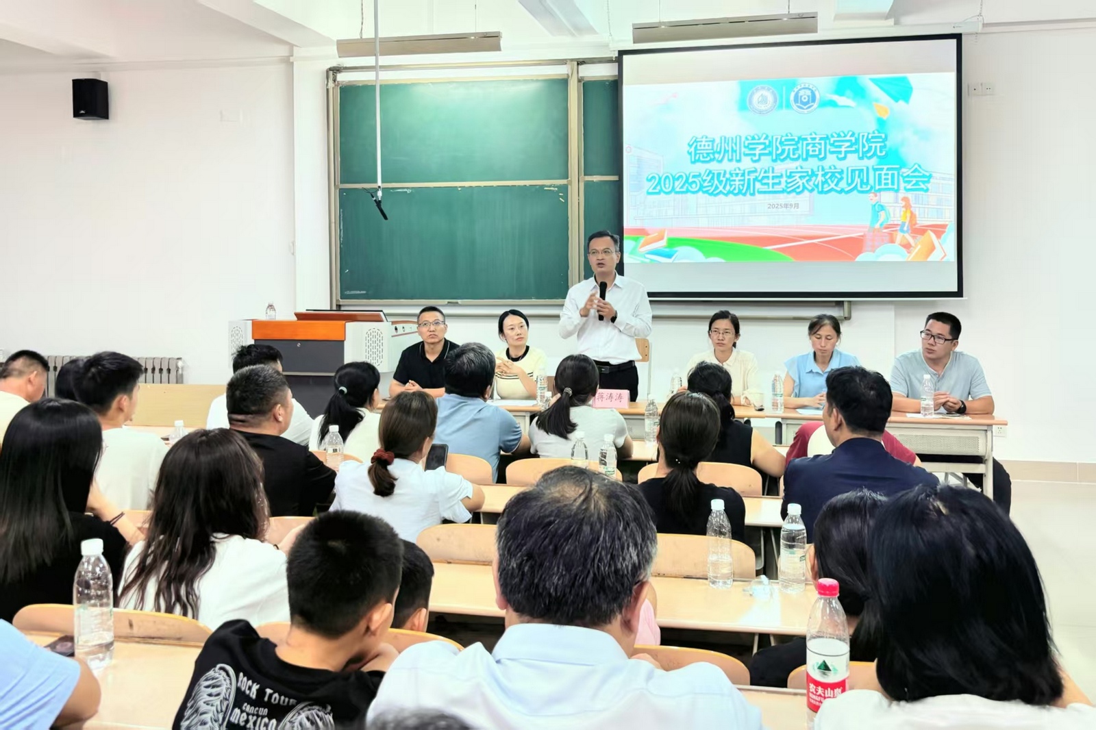 蒋涛涛代表学校对家长选择并信任德州学院表示衷心感谢。他表示,家长的信任是学校坚守育人初心、践行教育使命的重要动力。见面会上,蒋涛涛介绍了德州深厚的文化底蕴、学校扎实的办学传统以及南校区丰富的平台资源,为新生大学阶段成长规划提出了切实建议。蒋涛涛重点介绍了南校区近年持续推动的校园建设举措,包括学生宿舍提升改造、生活服务中心与一站式学生社区建设、教学楼与食堂环境优化等一系列硬件提升工程,让家长对学校的办学条件与发展前景有了更加直观和深入地了解。蒋涛涛对国际经济与贸易(专科)专业新生寄予殷切期望,鼓励同学们潜心钻研、不断提升自我,发扬艰苦奋斗、自强不息的精神,勇敢追逐人生梦想。同时,他也呼吁家长与学校保持密切沟通,强化协同联动,形成育人合力,共同为学生的全面发展和健康成长保驾护航。